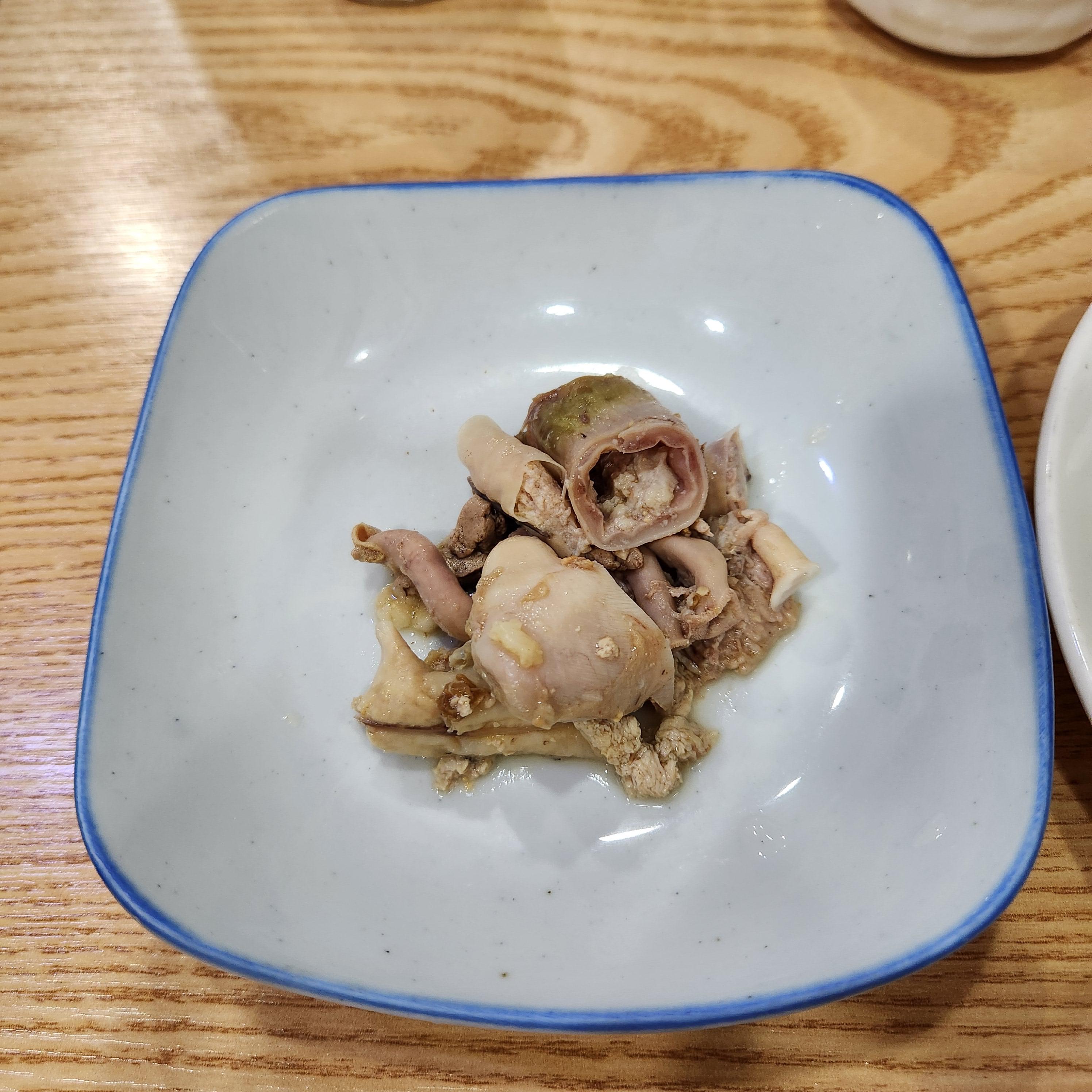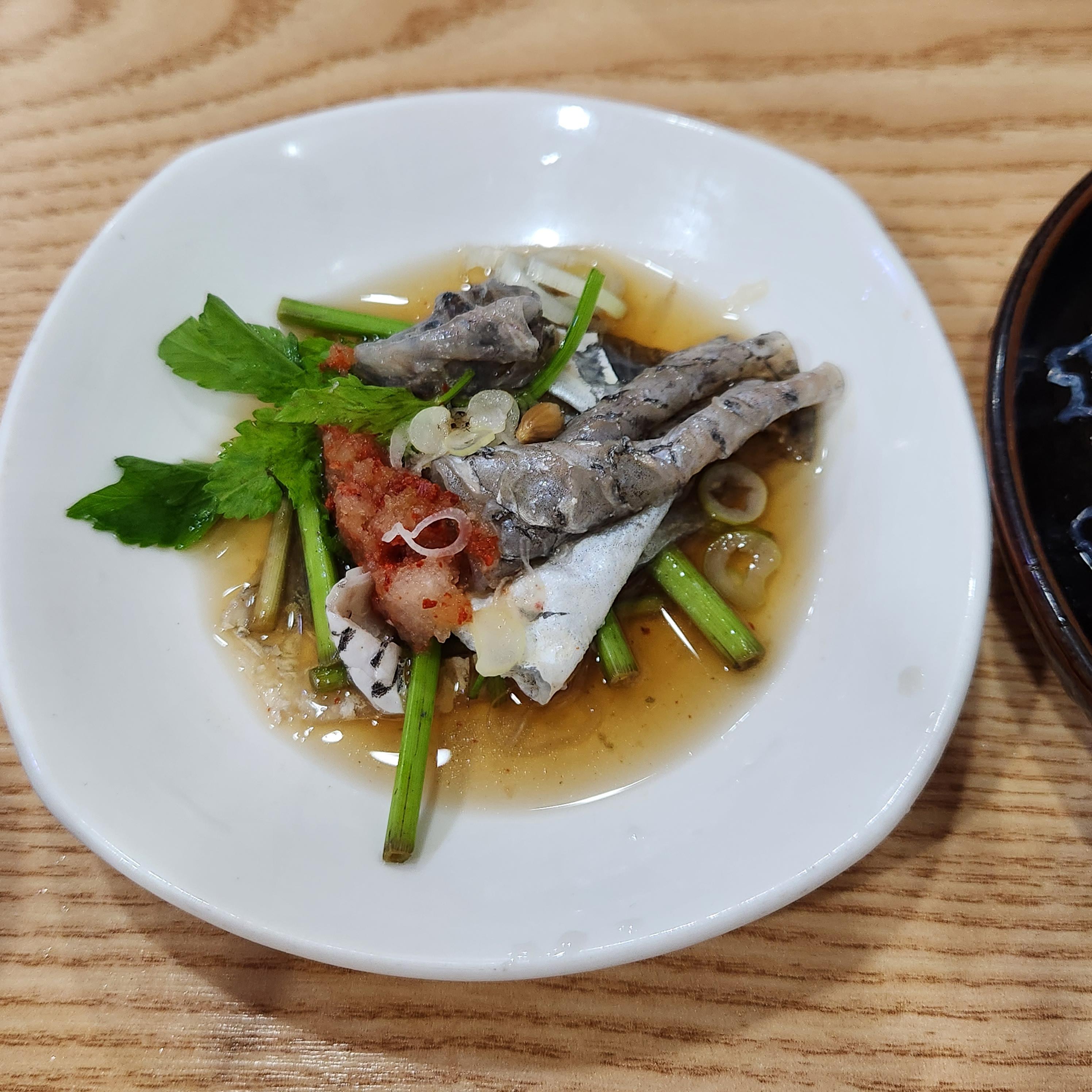 초절임 소스와 향긋한 미나리,마늘쫑의 조합이 괜찮았던 생선 껍질과 생선 내장 찜도 괜찮았습니다.
